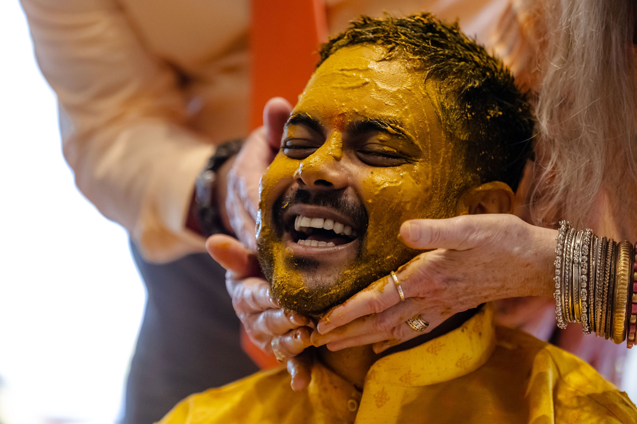 - The turmeric paste is applied to their face, neck, arms, hands, knees, and feet.
