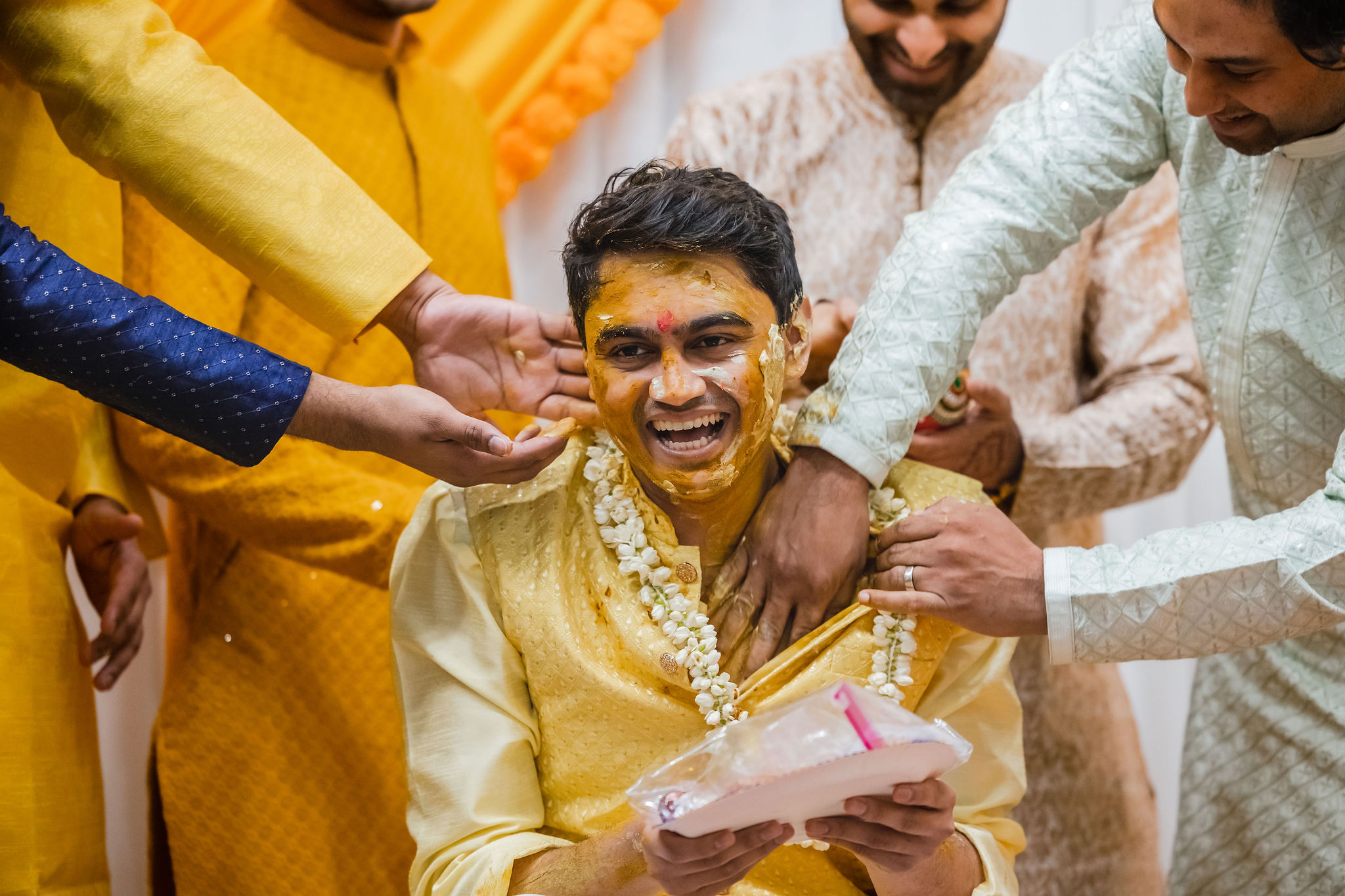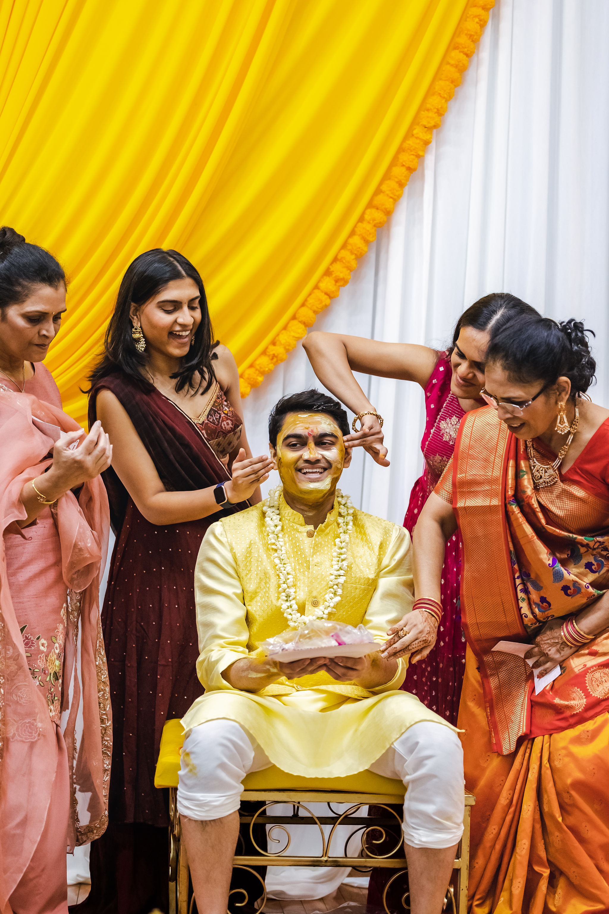 Family and friends take turns applying the Haldi paste to the bride and groom’s face, neck, arms, and feet. The ceremony is often accompanied by singing traditional songs, music, and laughter, creating a festive and joyous atmosphere. After the application of Haldi, the bride and groom are required to wait until the paste dries on their skin. They are then allowed to take a ritualistic bath or shower to cleanse themselves before the main wedding ceremony.The Haldi ceremony is not only a traditional ritual but also a time for family and friends to come together and celebrate the upcoming union. The vibrant colors, festive atmosphere, and meaningful customs make it a memorable event in the overall wedding festivities.