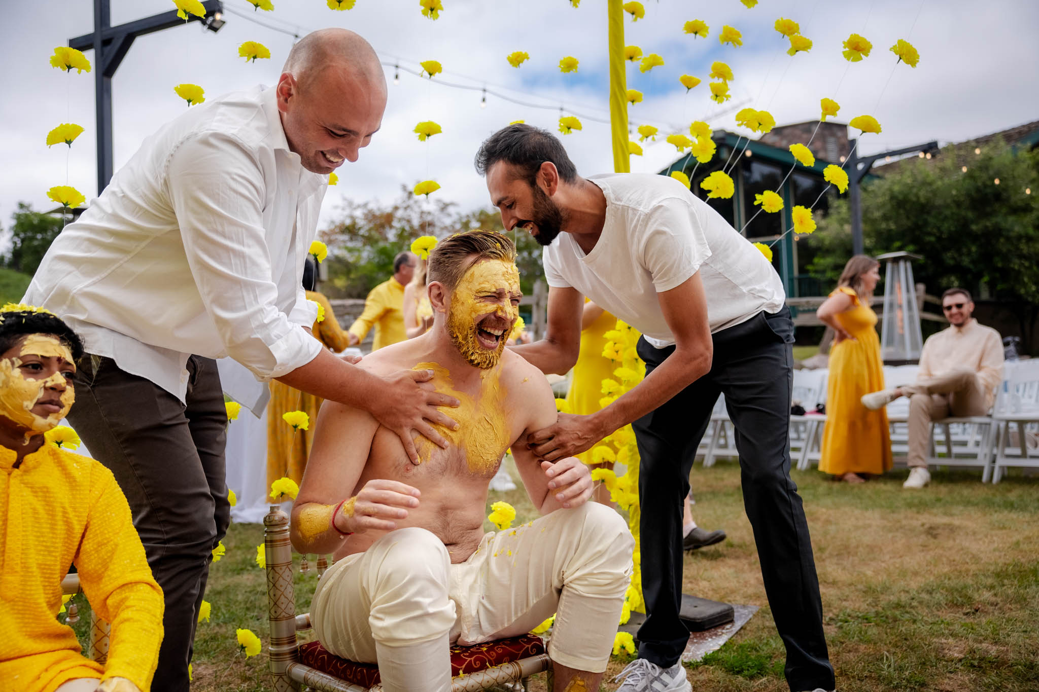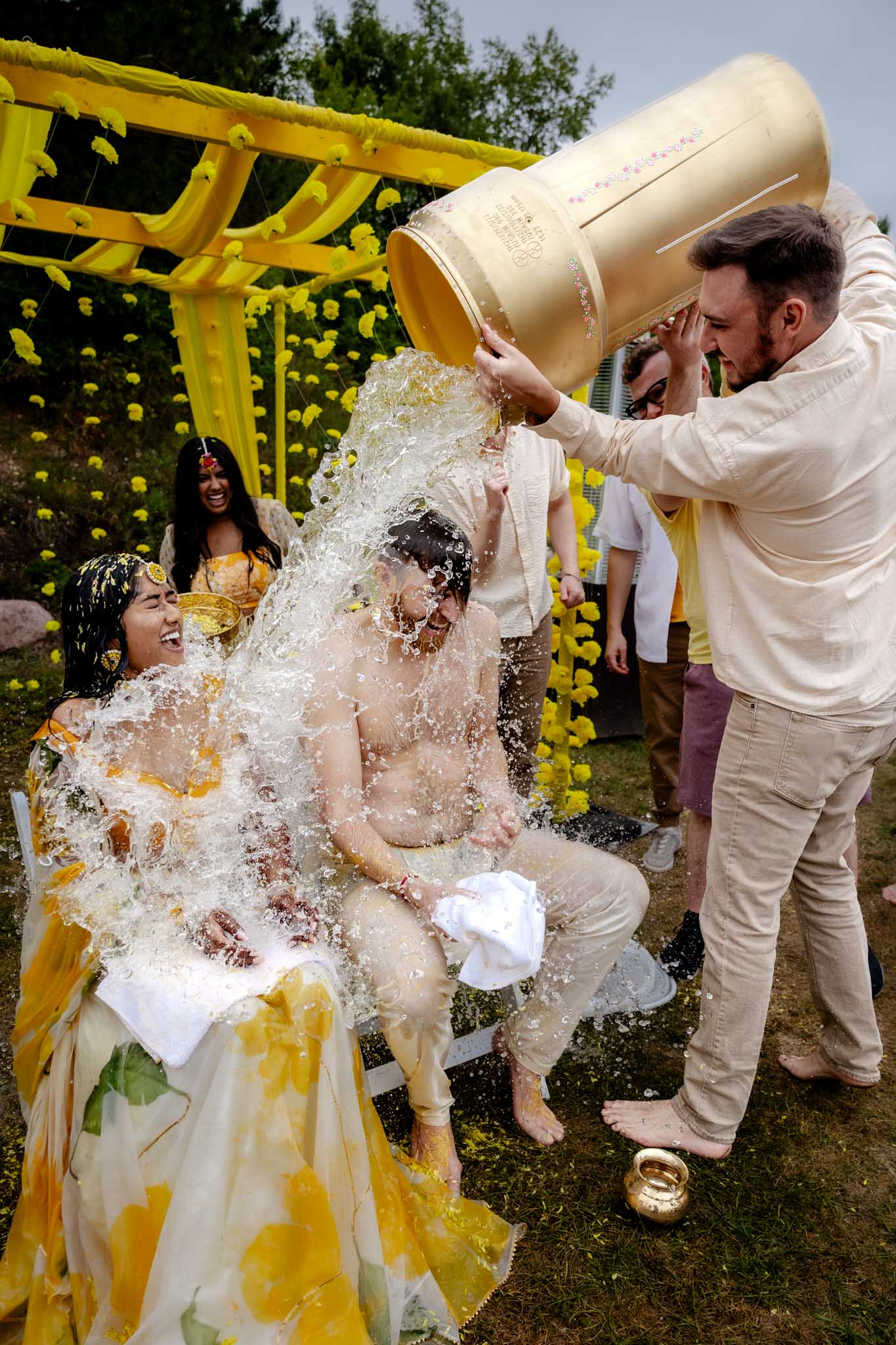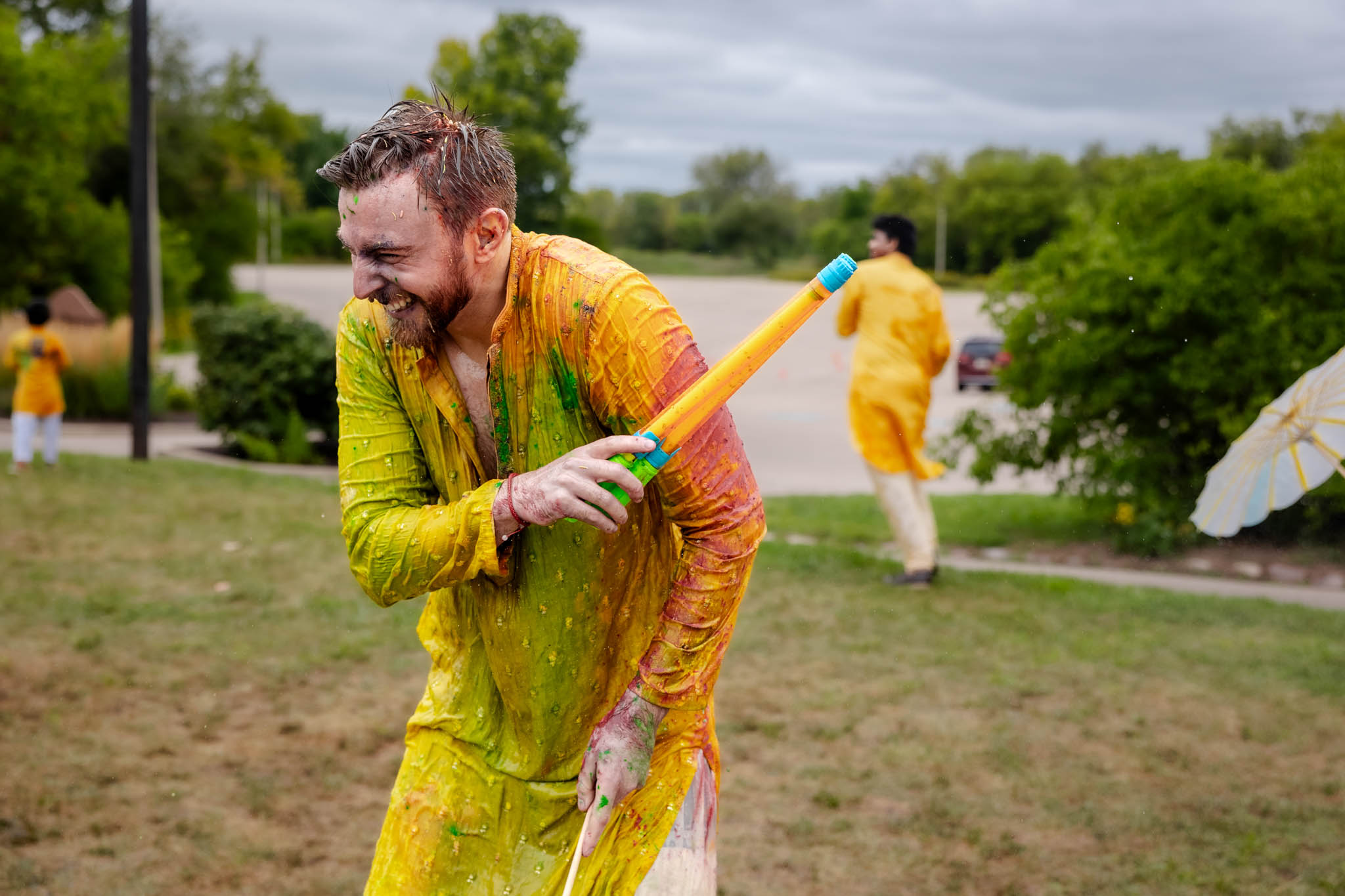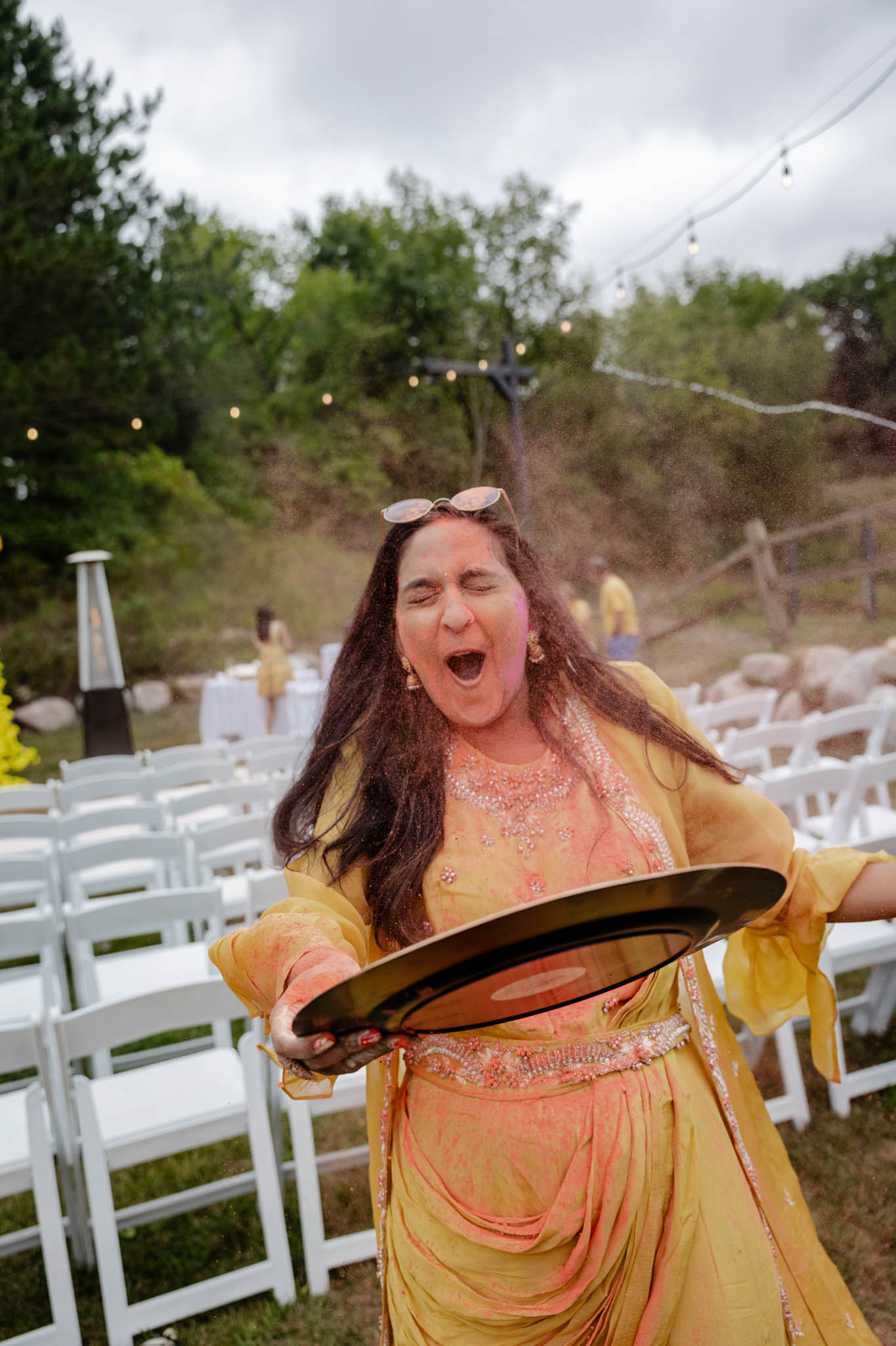 This is our first time shooting a wedding here. Lake Geneva is an upscale destination, and it’s a privilege to work here. It’s about an hour away from Chicago but located in a different state—Wisconsin.T he wedding lasted for three days, and the first day was really exciting. In the morning, there was the Haldi ceremony. A lot of family and friends attended, and everything was in shades of yellow. It ended with water and color splashing. We barely managed to escape without getting soaked and covered in color ourselves! 😊