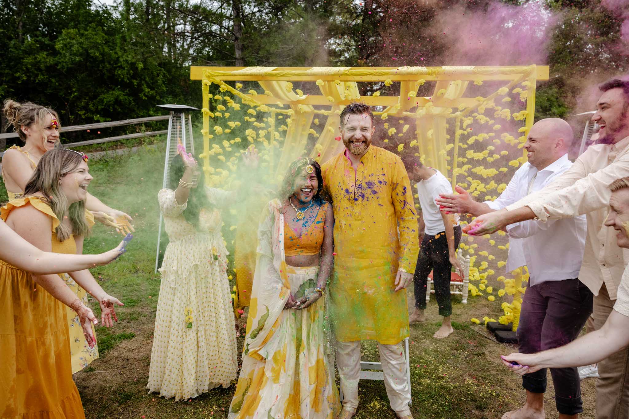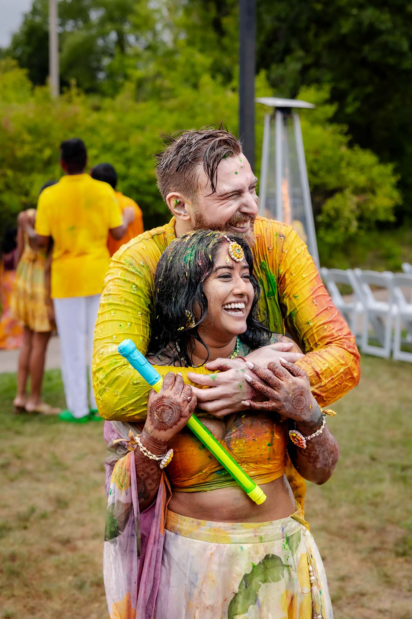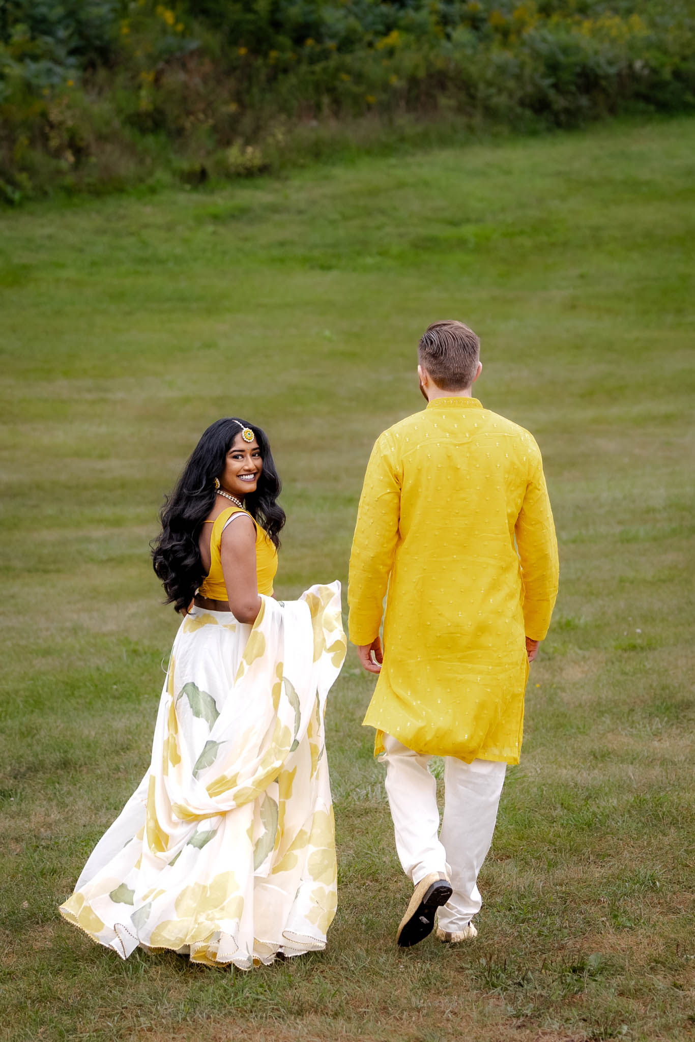 This is our first time shooting a wedding here. Lake Geneva is an upscale destination, and it’s a privilege to work here. It’s about an hour away from Chicago but located in a different state—Wisconsin.T he wedding lasted for three days, and the first day was really exciting. In the morning, there was the Haldi ceremony. A lot of family and friends attended, and everything was in shades of yellow. It ended with water and color splashing. We barely managed to escape without getting soaked and covered in color ourselves! 😊